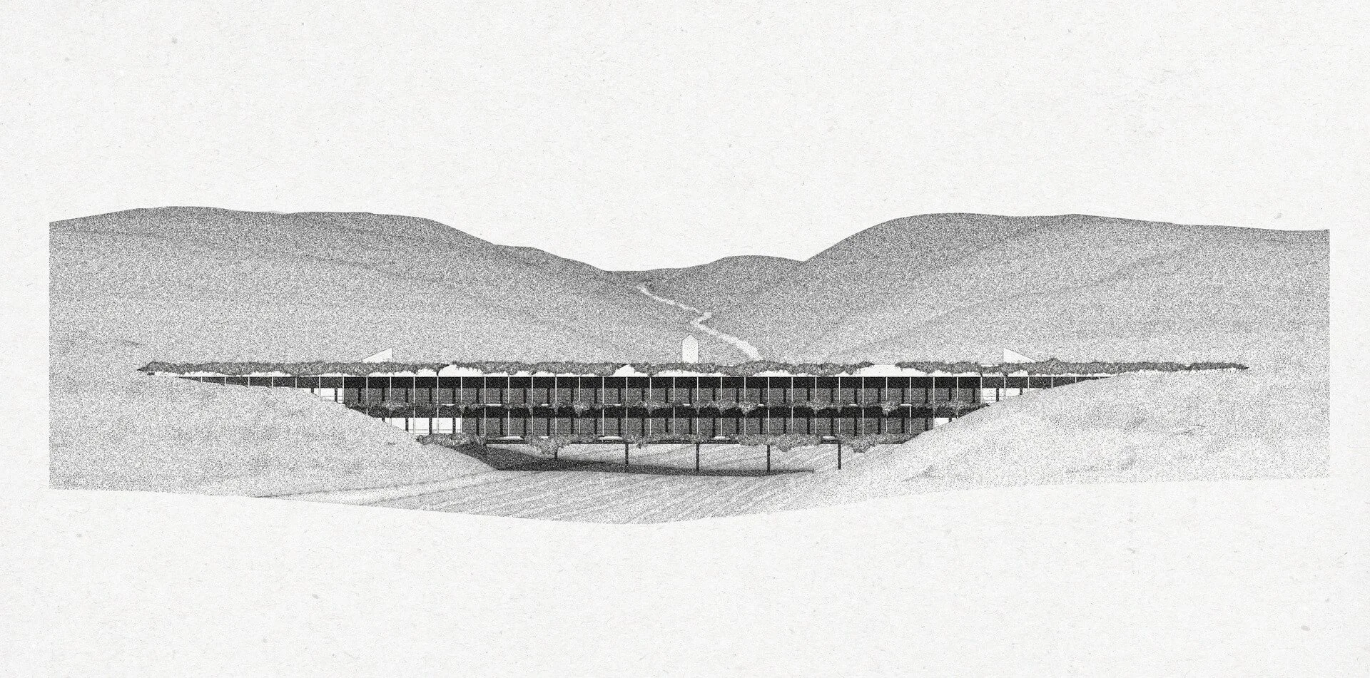 This drawing presents a winery in Austria designed as both a building and a bridge, merging architecture with infrastructure. Inspired by traditional aqueducts and viaducts, the structure spans the landscape, connecting two terrains while serving as a space for winemaking and gathering. The drawing, composed entirely of small dots, echoes historical architectural representations while utilizing modern digital tools—reflecting the project’s conceptual duality of past and present.