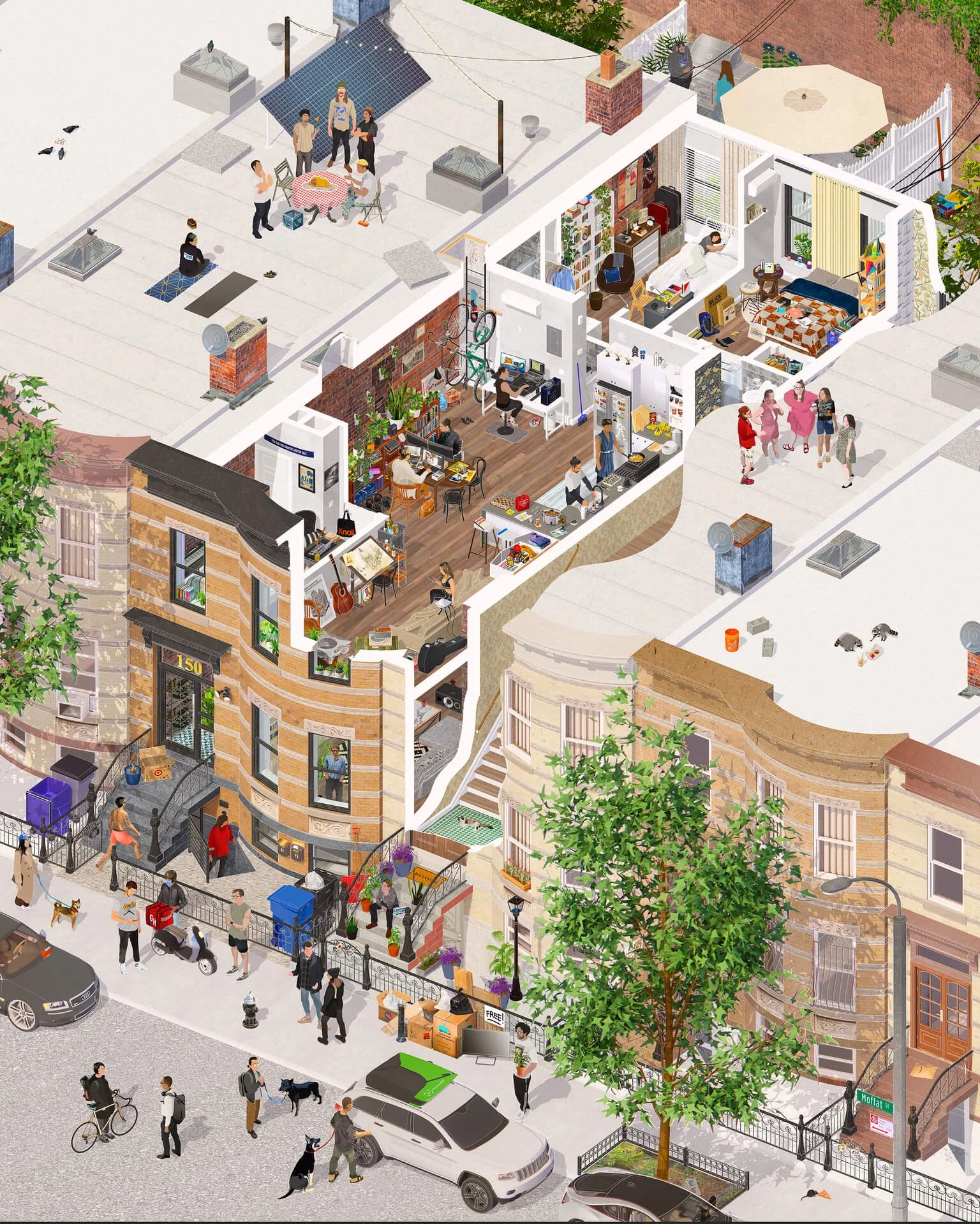 Brooklyn Stories is a faithful as-built drawing, capturing a chapter in the life my roommates and me. This turn-of-the-century rowhouse serves as both stage and witness to a rich life, where each object gain meaning and a rotating cast of lovers and friends comes and goes. Each object tells a story—like the night I accidentally set my landlord’s planter on fire, the house parties that called for fancy dishes and claimed a few guests, the salvaged Ionic capital turned coffee table, or marathon games of chess in our immaculate kitchen. These moments live on, intertwined with the characters who bring these stories to life. The drawing is a love letter to a fleeting yet profound chapter in our lives, to a place and time that shaped us.