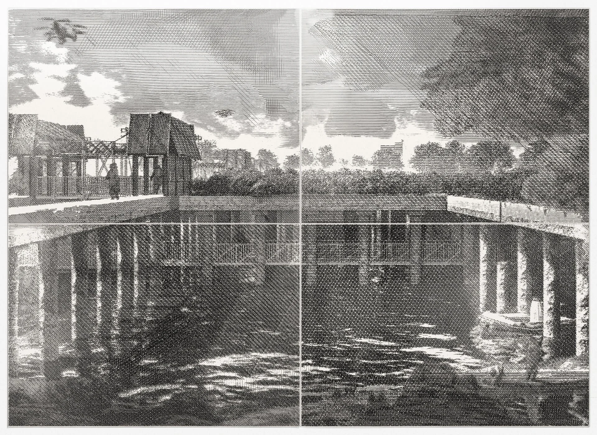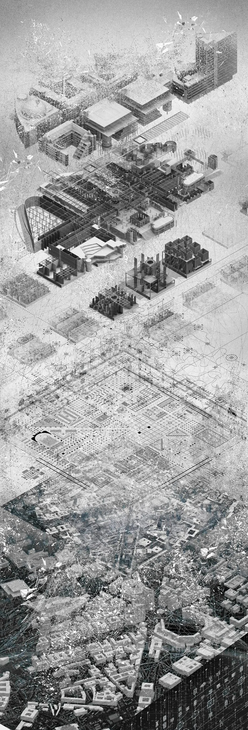 This project reused the pile foundations of a decomissioned powerstation to create a wholesale market for london. This drawing imagines the afterlife of the project redrawn through a modified 3D printer to resemble a Piranesi etching, entirely coded through Grasshopper scripts.