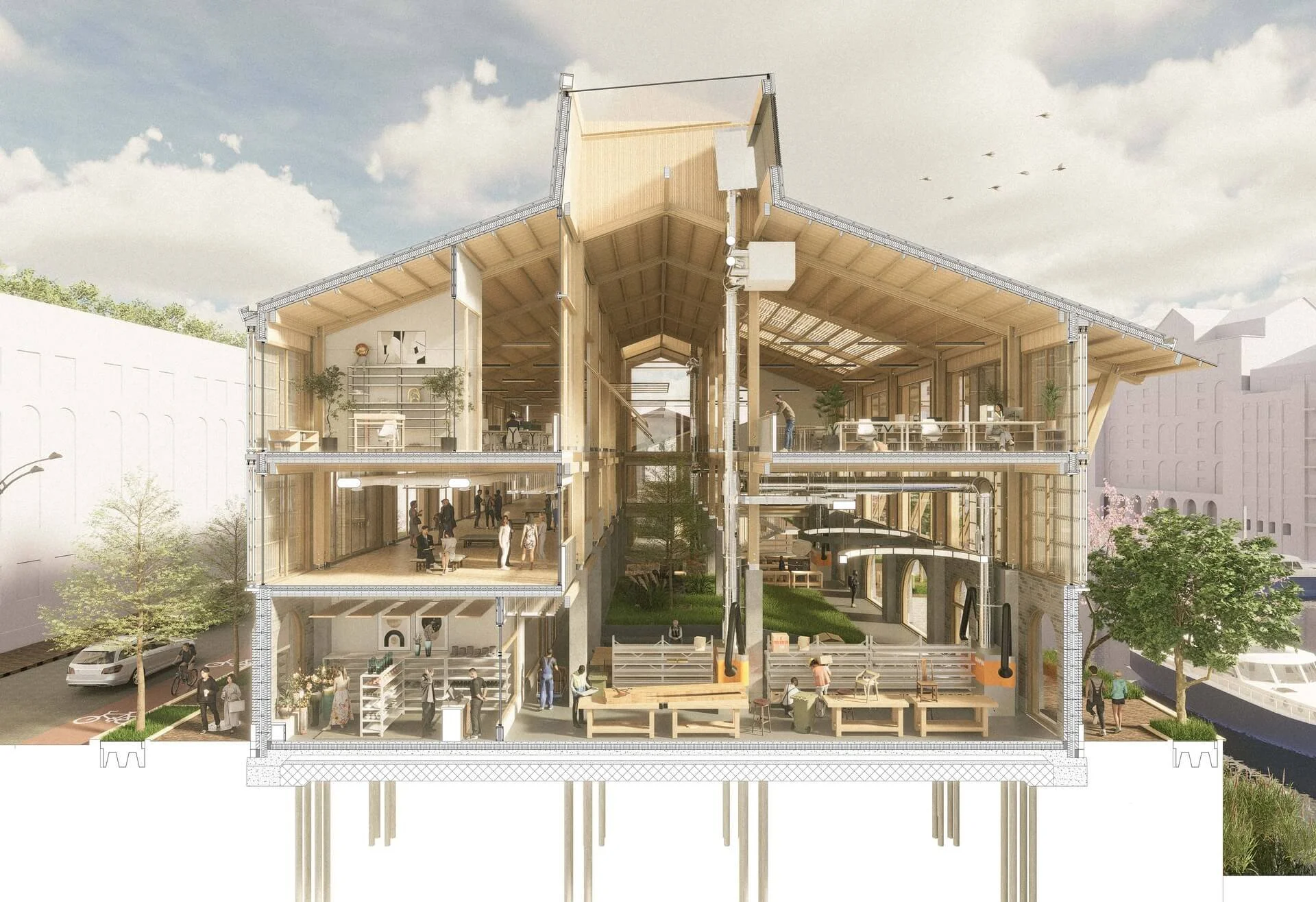 A comprehensive visual of the scheme, the drawing captures all aspects of the project - from architectural, structural, and tectonic, to environmental and landscaping. It showcases the main happenings inside The Makers' Collective, a workshop that facilitates the interface between the customers and craftsmen of Bristol. The building provides a year-round home for the makers of the city to work centrally and collaboratively, while being provided retail spaces that are afforded views into the working spaces; promoting the love and care that artisans pour into their work. The programme is further equipped with office space, a gallery, and an educational workshop to present to the youth a non-conventional career path.