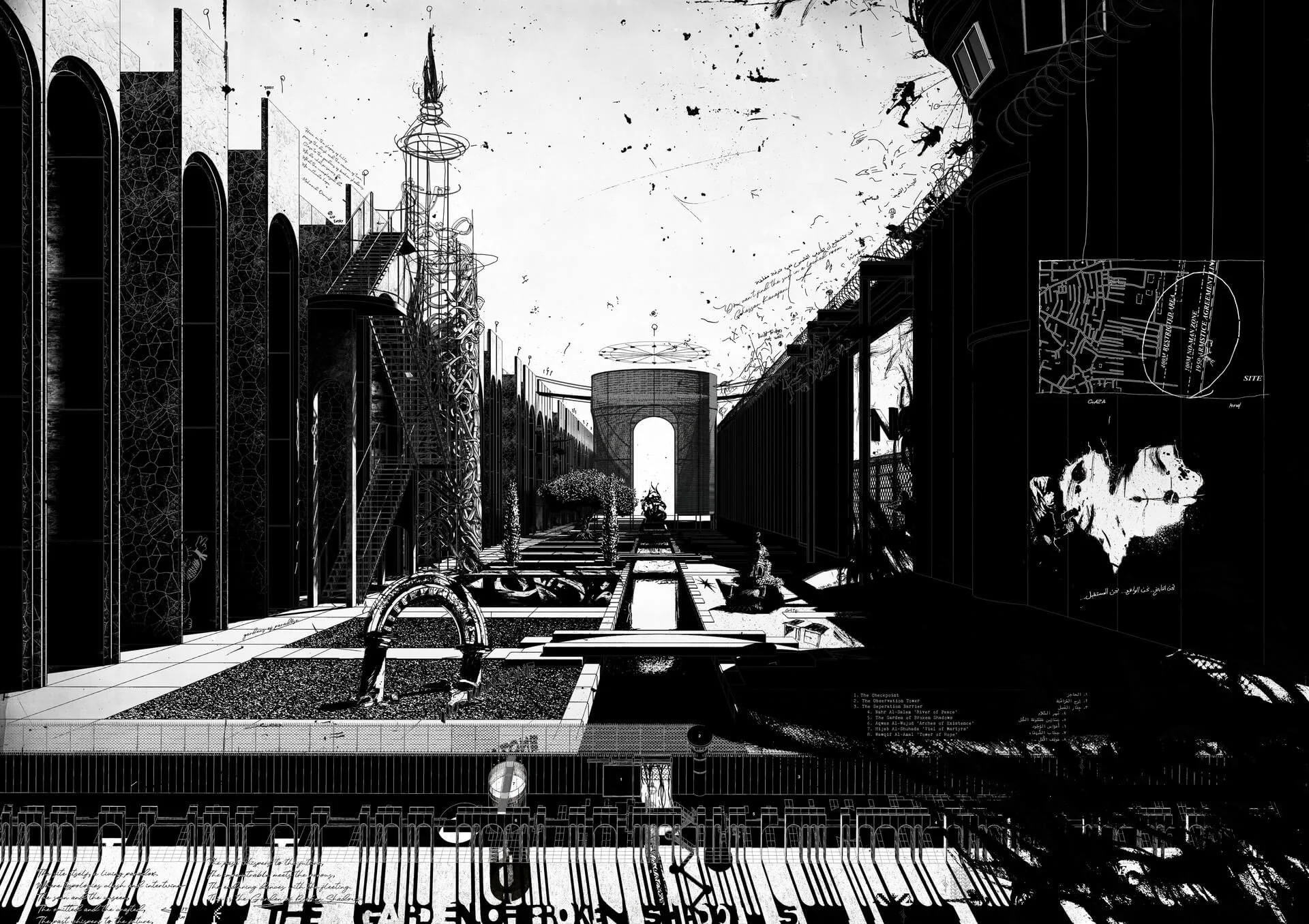 'The Garden of Broken shadows' confronts Gaza’s fractured reality along the 1950 Armistice line—a scar etched by walls, towers, and checkpoints. Time collapses here: concrete monoliths of colonial apparatus crumble into arches of resilience, while a river stitches past to future with scattered bridges. To the right, oppression’s machinery—checkpoints, barriers dissolves into voids; to the left, a tower rises, cloaked in Gazan poetry, its Arabic calligraphy a lament and a anthem. Olive and cypress roots thread through Islamic healing gardens, defiance in their growth. At the river’s end, a flame-shaped sculpture of woven text flickers—an eternal witness to Nakba’s ashes and 76 years of resistance. Inspired by Mahmoud Darwish Palestine's Poet