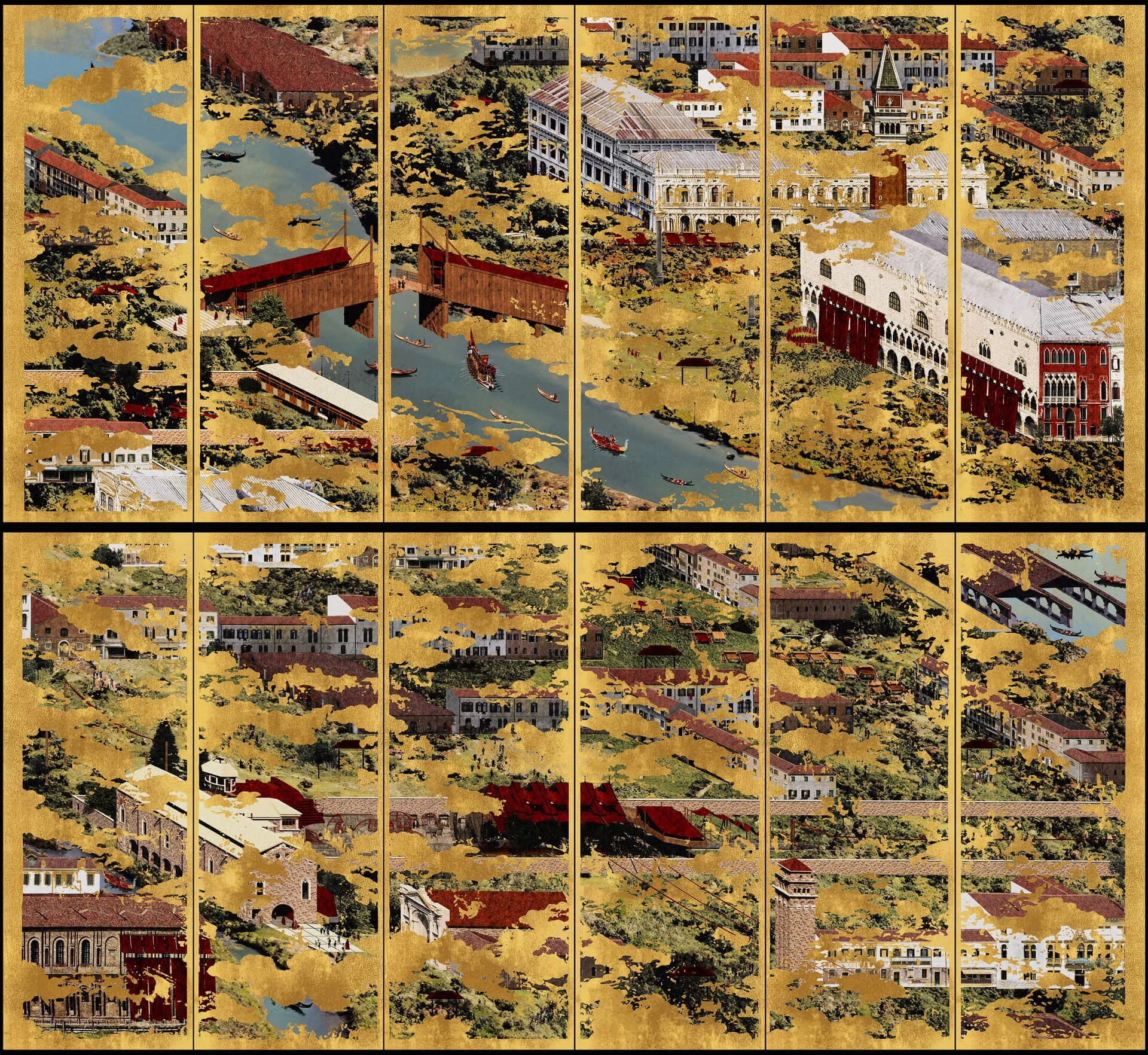 Tales of Liminality, a 12-panel screen set, reimagines Venice by intertwining the city’s rich silk-weaving heritage with a broader, transnational history. Drawing inspiration from the Japanese rakuchū rakugai-zu paintings, the work challenges conventional perspectives of urban space, critiquing the Eurocentric frameworks that have shaped the development and remembering of cities. By tracing the dialogues between East and West along the Silk Roads, the piece highlights the fluidity of cultural boundaries and intertwining of multiple histories, offering a new lens through which to view Venice as a city of liminality.